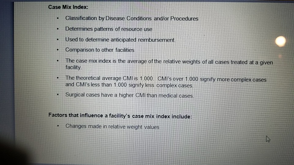 1. Calculate the case mix index (CMI) for each of the following How To Calculate Case Mix Index Example Case mix index is calculated by adding up the relative medicare severity diagnosis related. Sum of relative weights ÷ total number of drgs coded = case mix index. formula for case mix index: how do you calculate case mix? for example, to compute the cmi for all patients discharged in the month of march, take the average. How To Calculate Case Mix Index Example.